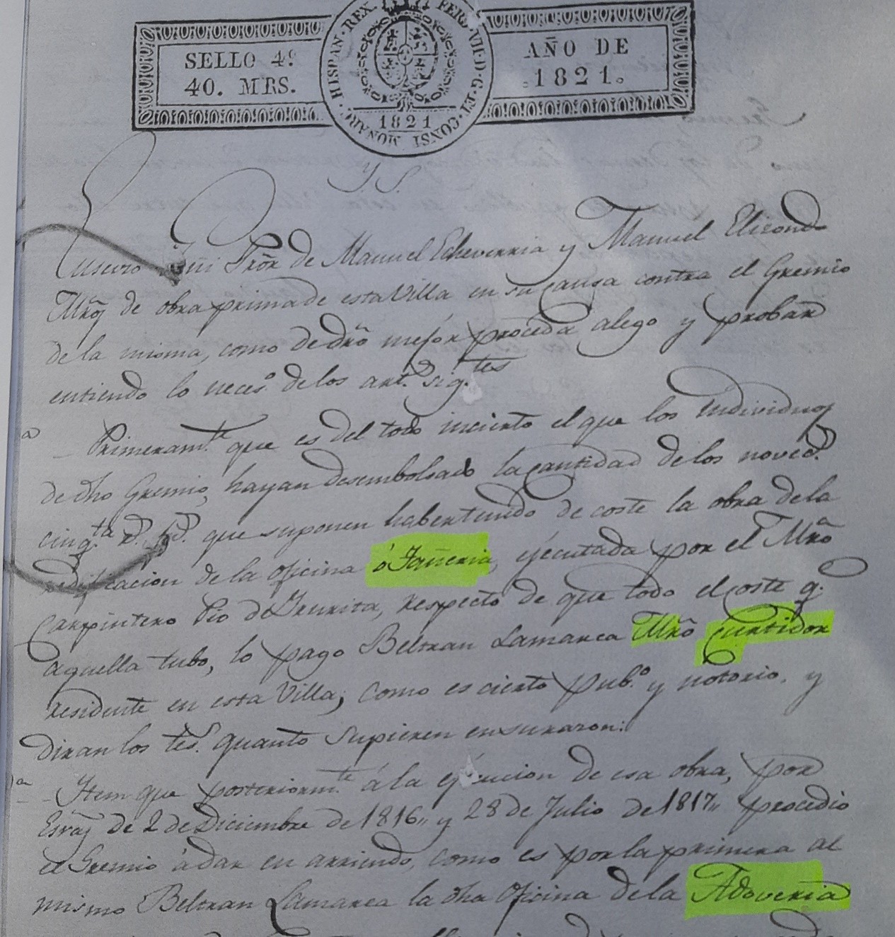 Como contestación a la resolución determinada por el gremio de «Obra prima» que a través del procurador Lorenzo Bergara, se les ha transmitido a los solicitantes, por el procurador Eusebio Goñi, de los dichos Manuel Echeverría y Manuel Elizondo también, maestros de “Obra prima”, como mejor procede la alegación y pruebas que considero necesario, en los artículos siguientes: